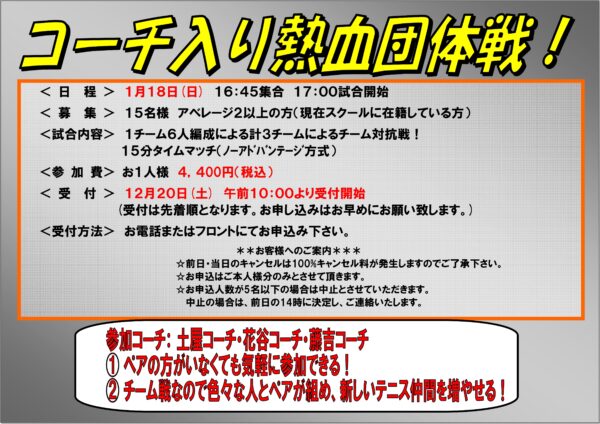 第100期 1/18(土)コーチ入り熱血団体戦!!