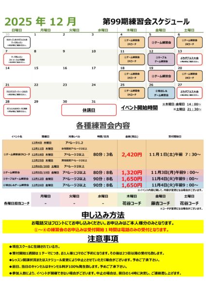 第99期 11/2(日)A1限定楽楽ダブルス練習会※プライベートレッスンあり!