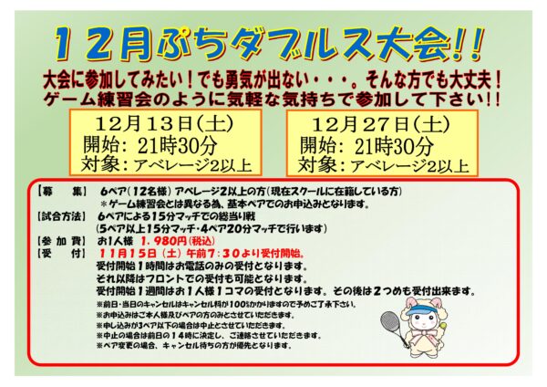 第99期 11/30(日) セミオープン女子ダブルス大会 ※空き状況5組空き有