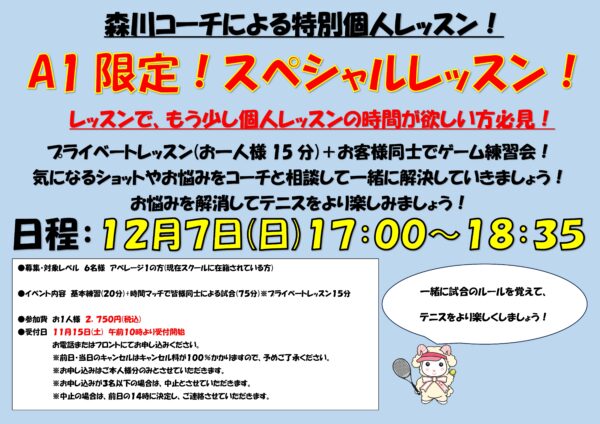 イベント&新着情報 第99期 12/7(日) A1限定!スペシャルレッスン! 2025年11月08日 « 第99期 11/30(日) セミオープン女子ダブルス大会 ※空き状況5組空き有 第99期 12月ぷちダブルス大会 »