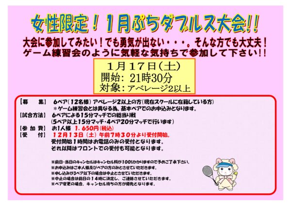 第100期 1/17(土)女性限定ぷちダブルス大会!