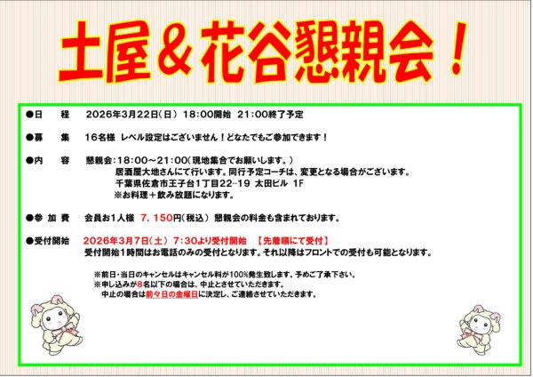 イベント&新着情報 第100期 3/22(日)土屋&花谷懇親会!! コーチとテニス仲間と飲んで盛り上がりましょう! 2026年02月28日 « 第101期 コーチに挑戦スケジュール! 第101期 4月練習会イベントスケジュール »